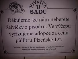 „Dziękujemy, że nie nie zabieracie nam żółwia z pisuaru. Przy nalewaku do piwa oferujemy adopcję za cenę półlitrowego Pilsnera 12o”