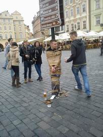 Staromestske namesti: najprawdopodobniej wieczór kawalerski – przylepienie kolegi do słupa. Reakcje ludzi były różnorodne. Poszkodowany w ciągu pół godziny mógł się napić darmowego piwa od przechodniów, zapalić cygaro, być ucałowanym przez turystki, a także zarobić trochę drobnych. Negatywnych reakcji nie zanotowano.