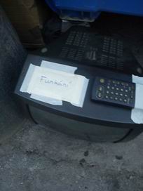 Blisko kontenera na śmieci, telewizor do wzięcia z napisem: „działa”. Pilot w komplecie