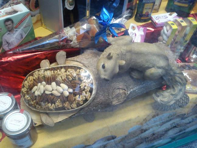 Kolejna wystawa sklepu spożywczego. Łasica pilnująca orzeszków.