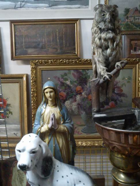A także wystawa sklepowa punktu, gdzie możesz kupić rzeźbę pieska, wypchaną sowę i rzeźbą Matki Boskiej. Wszystko zestawione w jednym miejscu.
