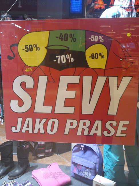 Reklama zniżek w markecie? W Czechach w formie świni, której różne partie ciała mają inną obniżkę cenową. Oczywiście sprawa dotyczy sprzedaży ubrań.