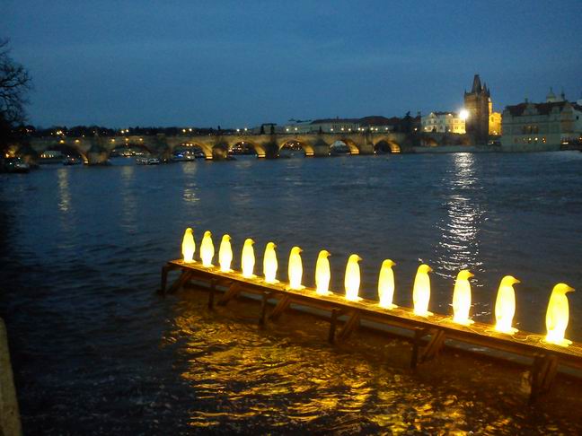 Widok na Most Karola z pięknymi, świecącymi, kiczowatymi pingwinami. Dzieło Dawida Czernego. W perfekcyjny sposób zabijają panoramę Wełtawy pokazując jednocześnie kiczowatość biznesu turystycznego.